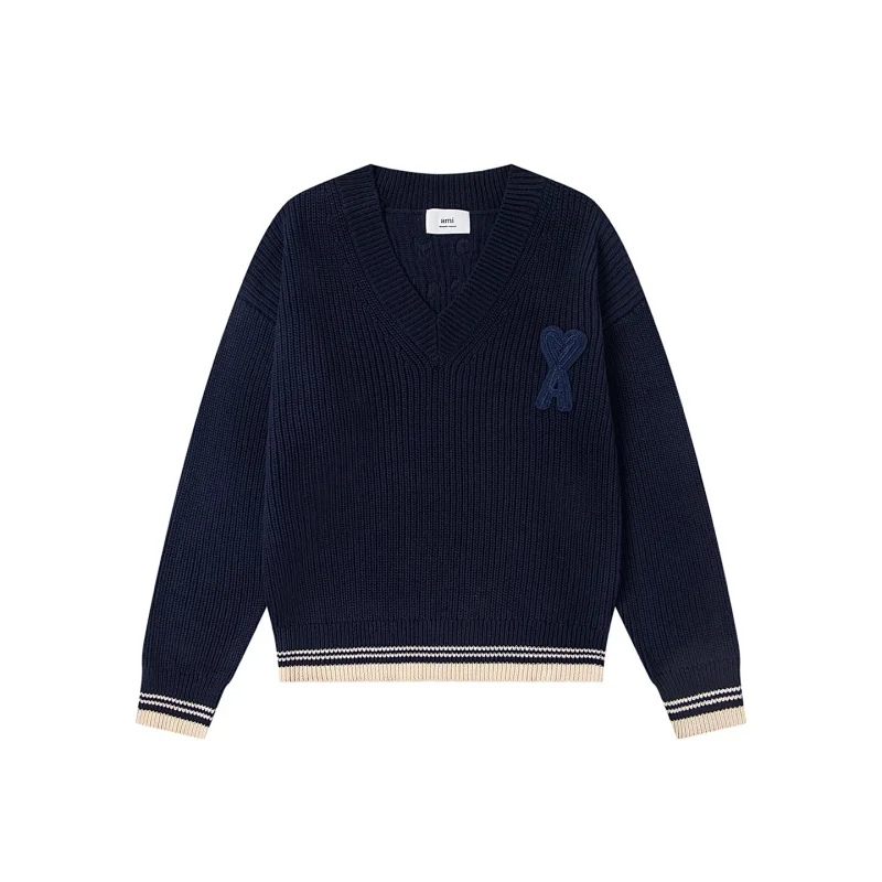 AMIPARIS Knitted Striped V-Neck Drop-Shoulder Wool Sweater-5156
