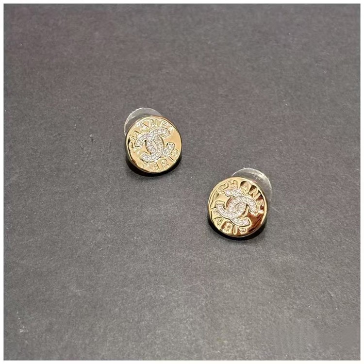 Chanel gold round double c rhinestone letter gold coin earrings-3741
