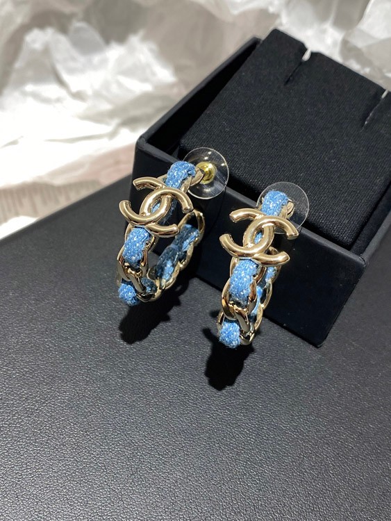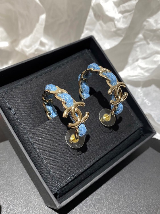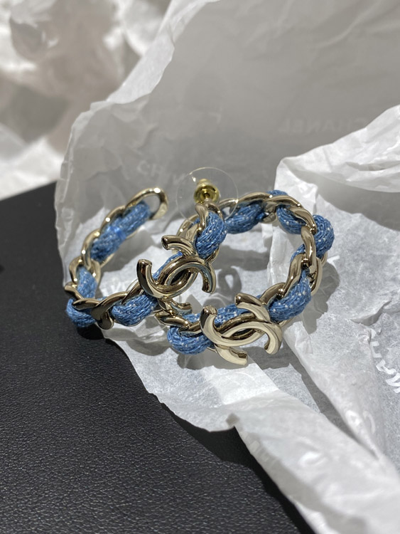 Chanel Light Gold Denim Blue Hoop Earrings-3595