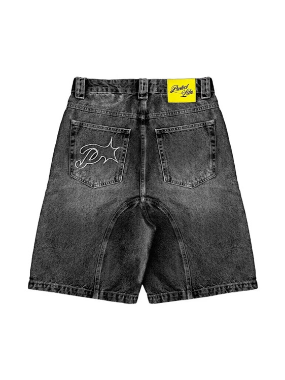 Protect Embroidered Loose Harajuku Washed Denim Shorts-4926